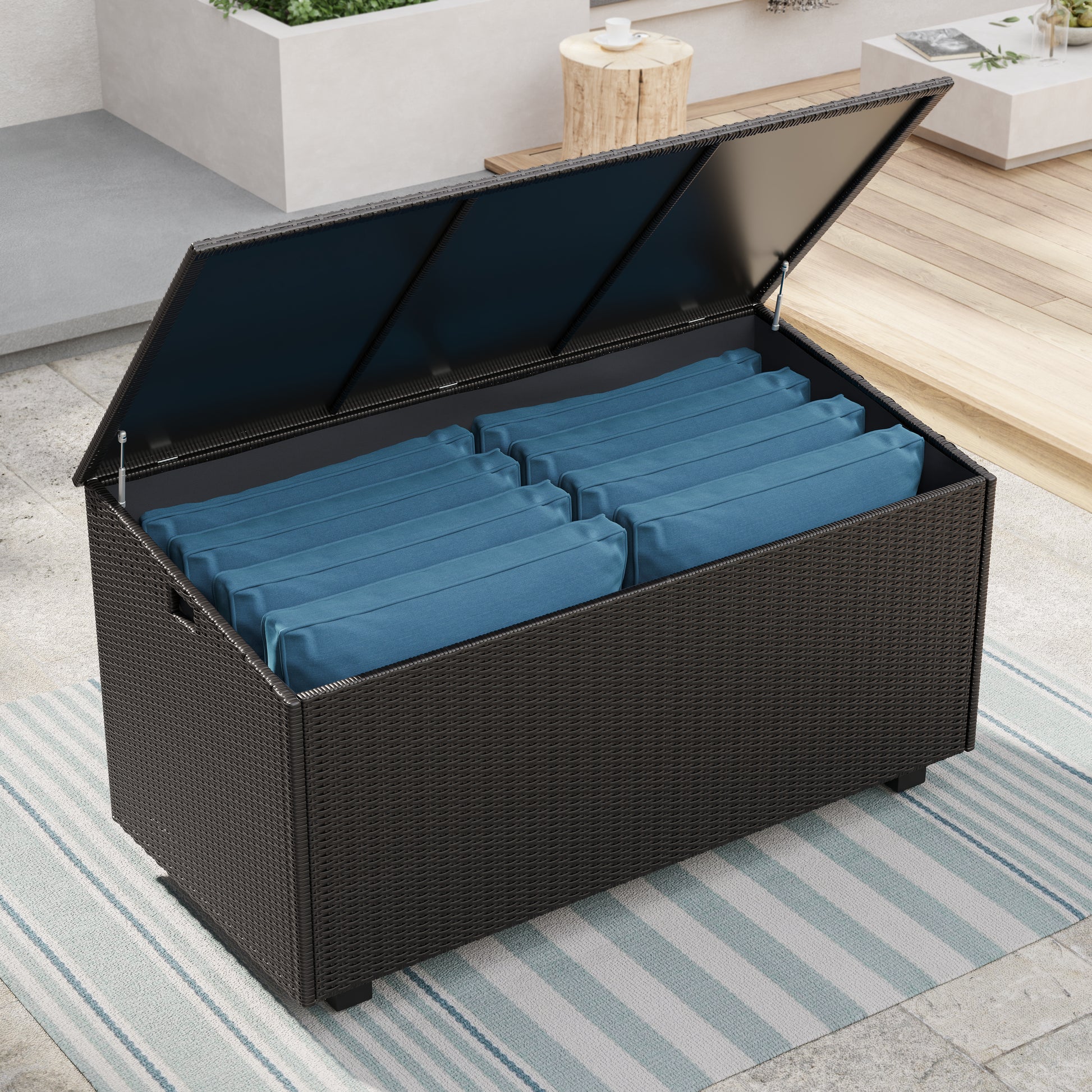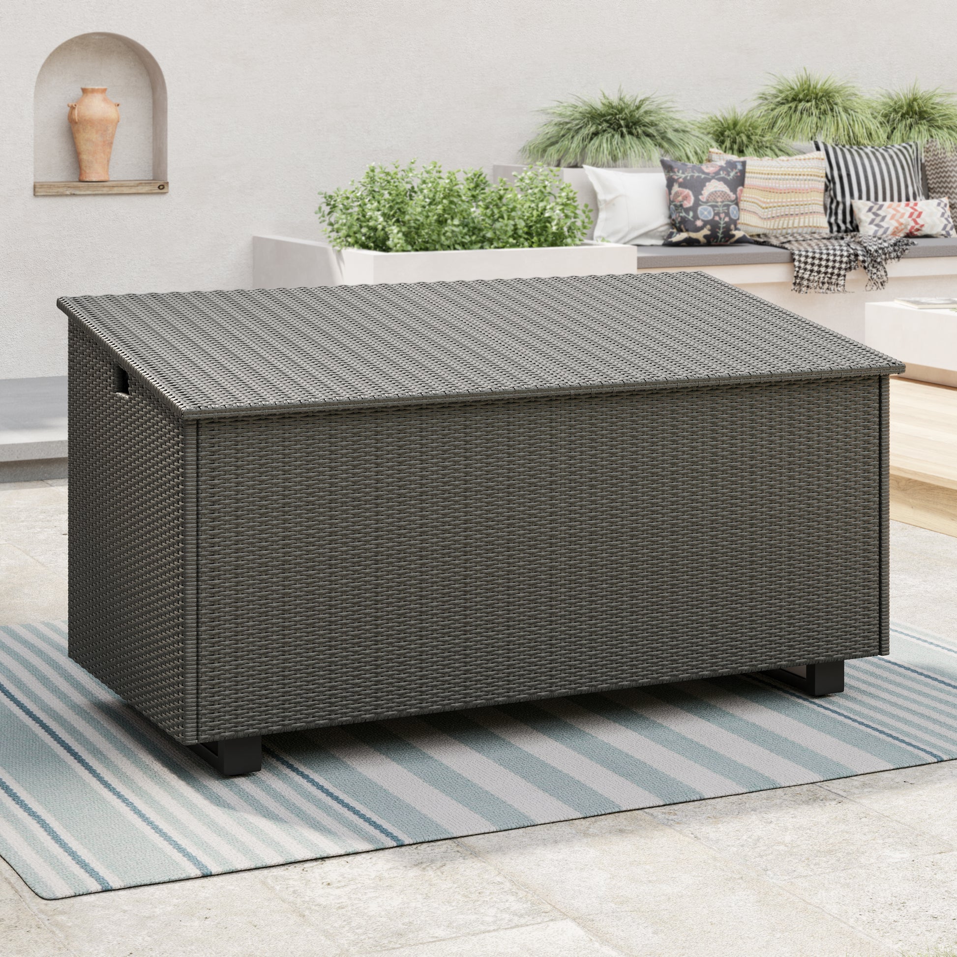 This understated storage box is perfect for storing cushions or other garden accessories. Featuring an aluminum frame covered in durable woven resin, this patio storage box also has a watertight plexiglass lid and pneumatic hinges. Whatever your current or future outdoor décor, this patio storage box for cushions and other items will add both utility and style for years to come!