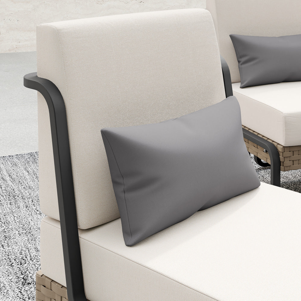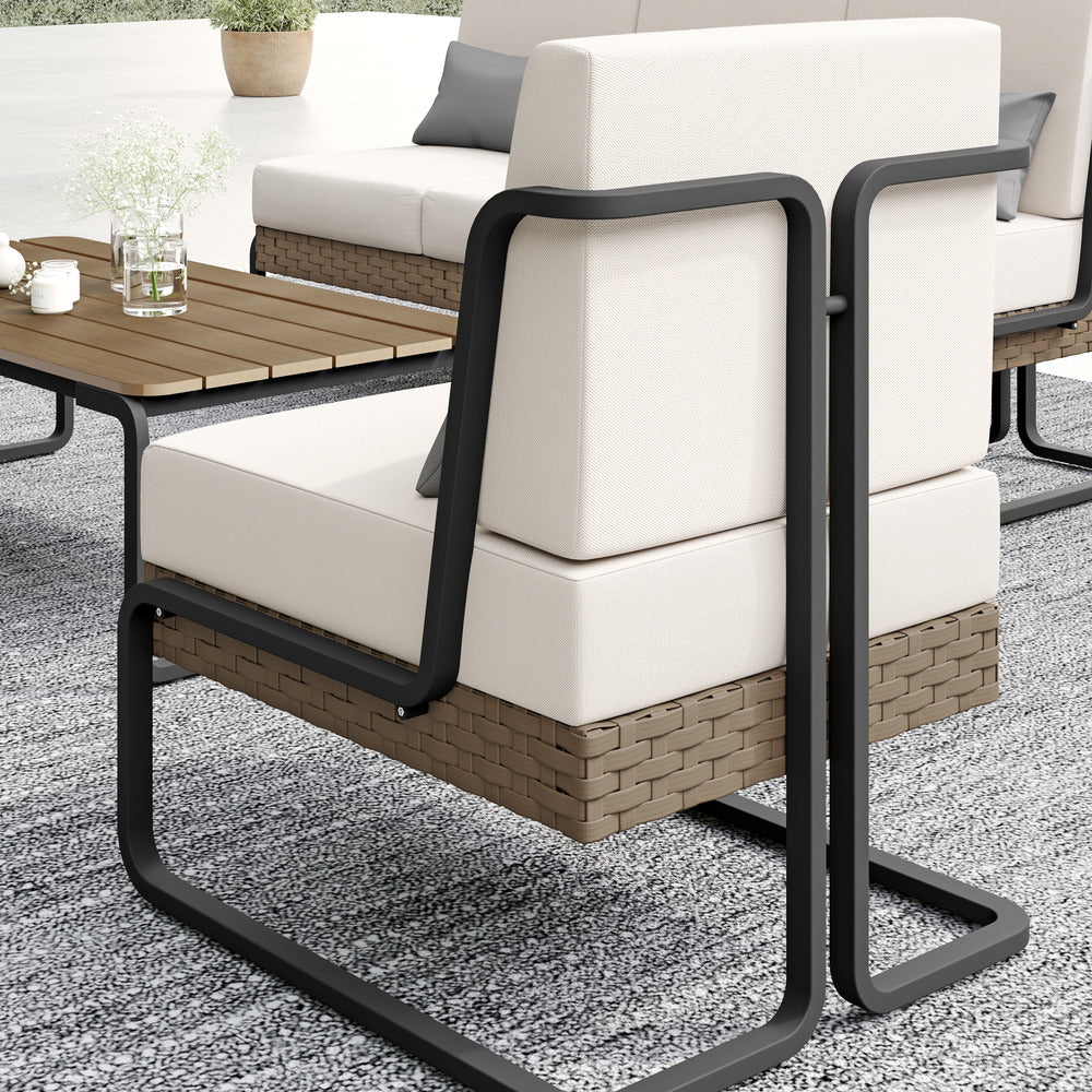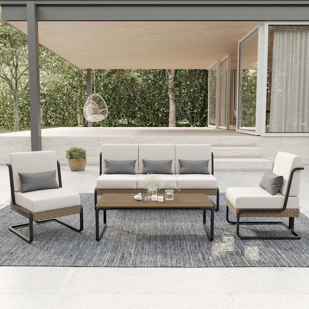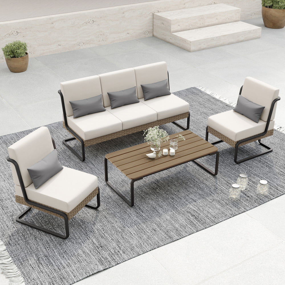 - The set includes 1 3-seater sofa, 2 chairs, 1 table, 5 seat cushions and 5 decorative cushions