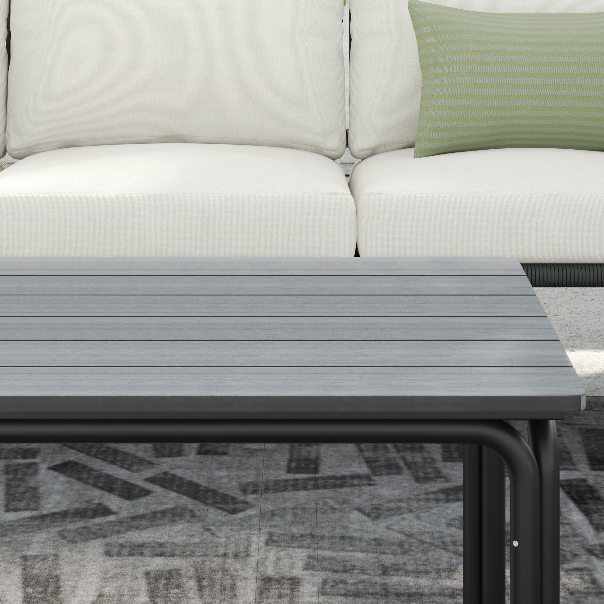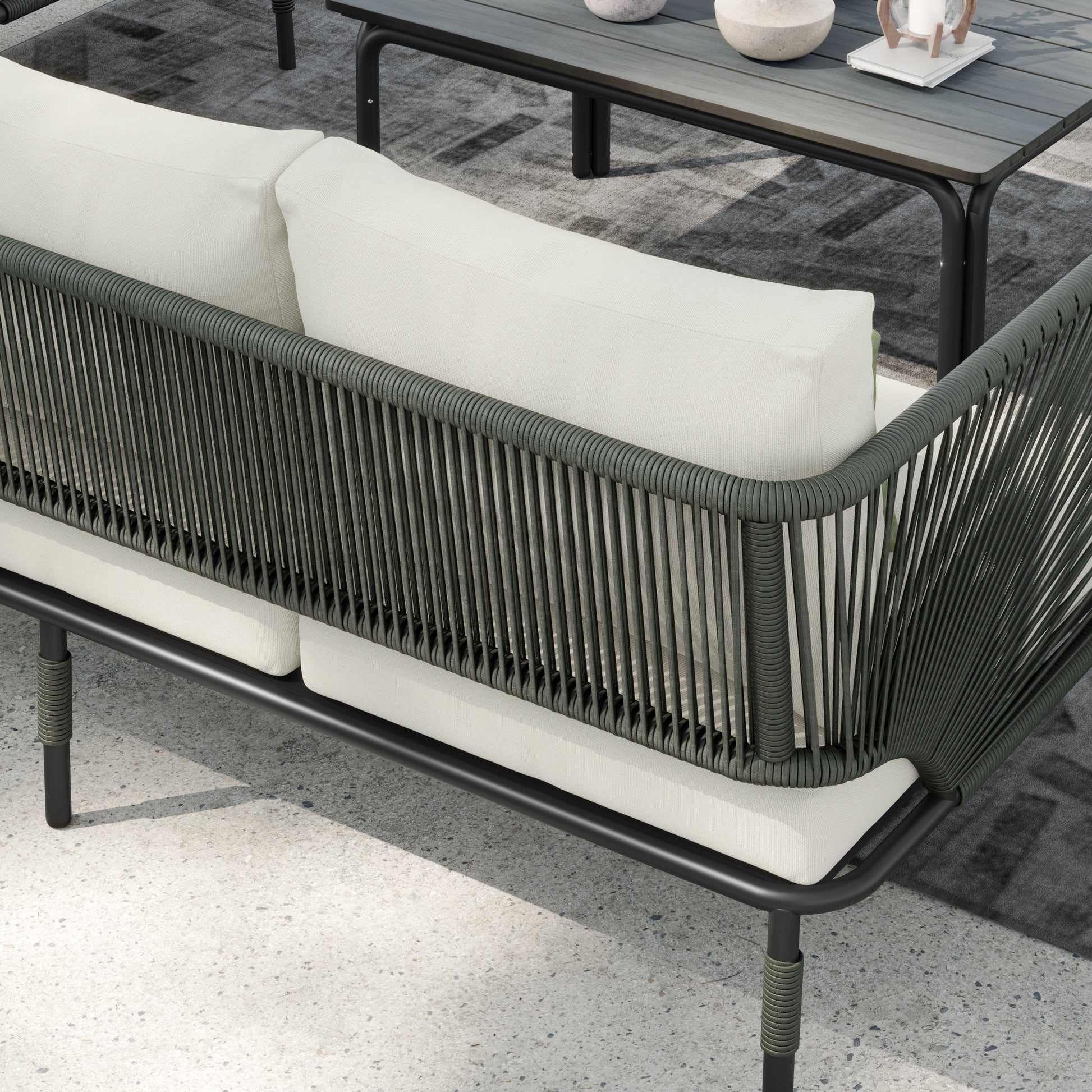 - The set includes 1 3-seater sofa, 2 chairs, 1 table, 10 seat cushions and 4 decorative cushions
