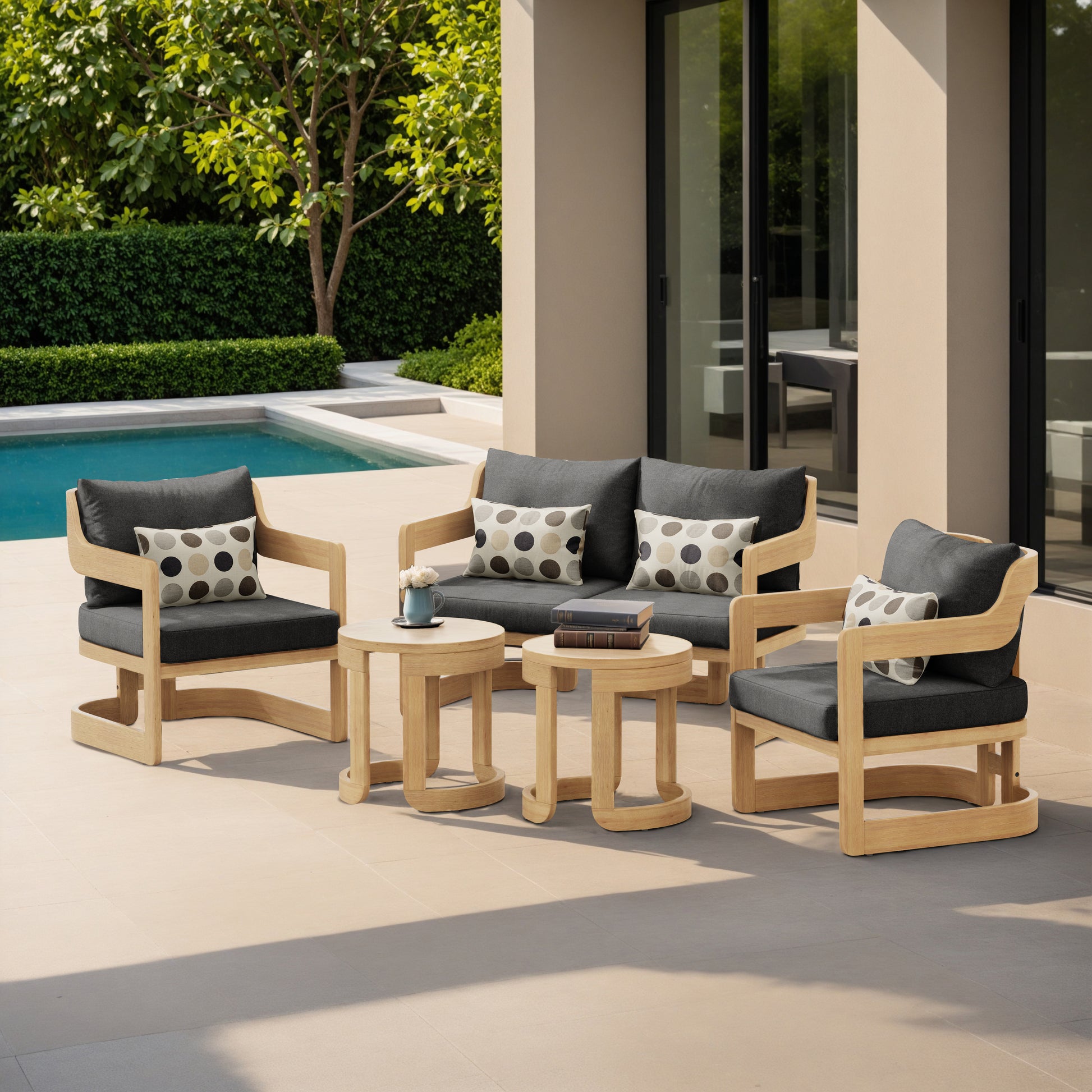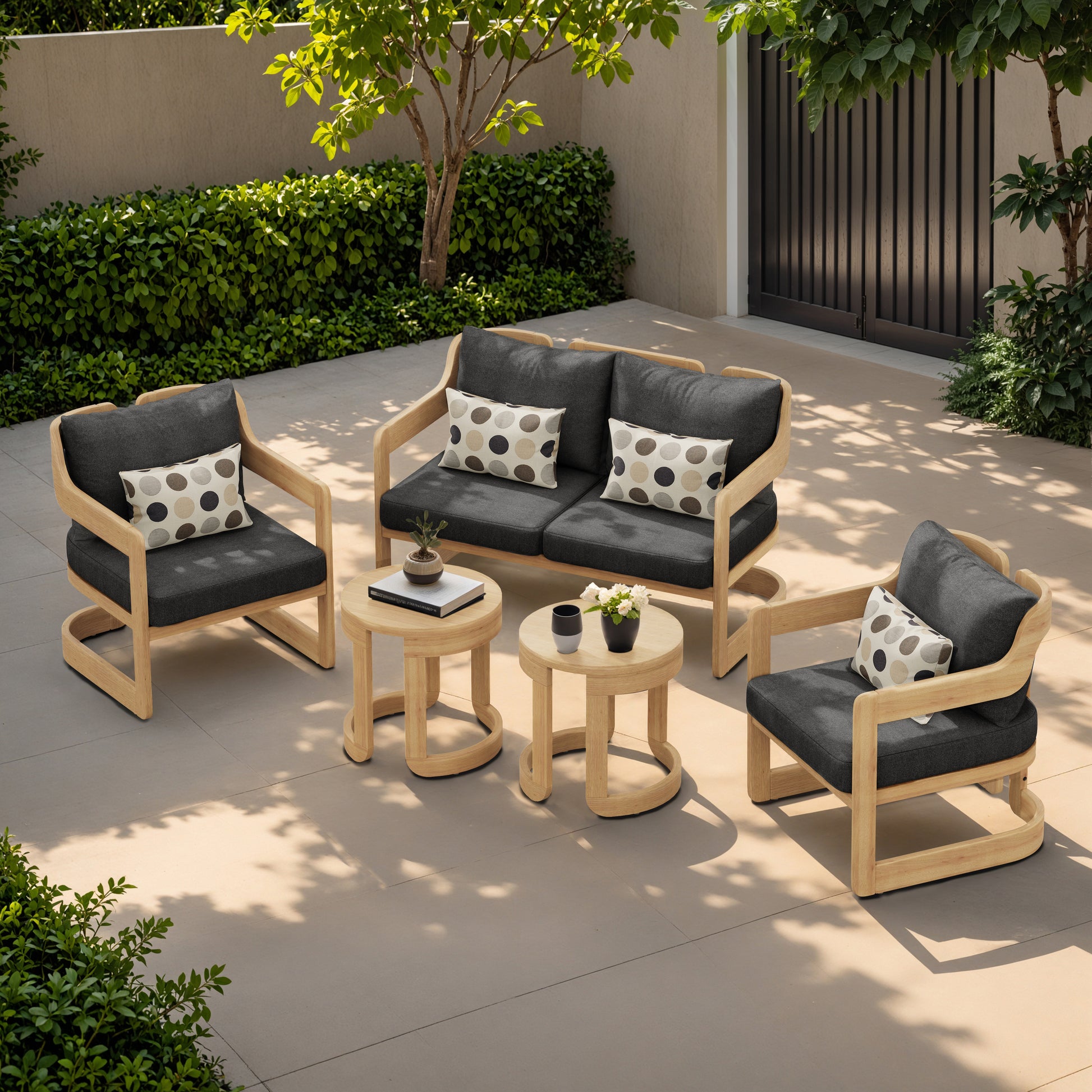 The Begonia outdoor furniture set embodies elegance and comfort in a durable and sophisticated setting. It consists of two armchairs, a two-seater sofa, and two side tables, creating a welcoming and harmonious atmosphere. Crafted from high-quality, durable materials, this set is designed to withstand the elements while adding a touch of refinement to your outdoor space.
