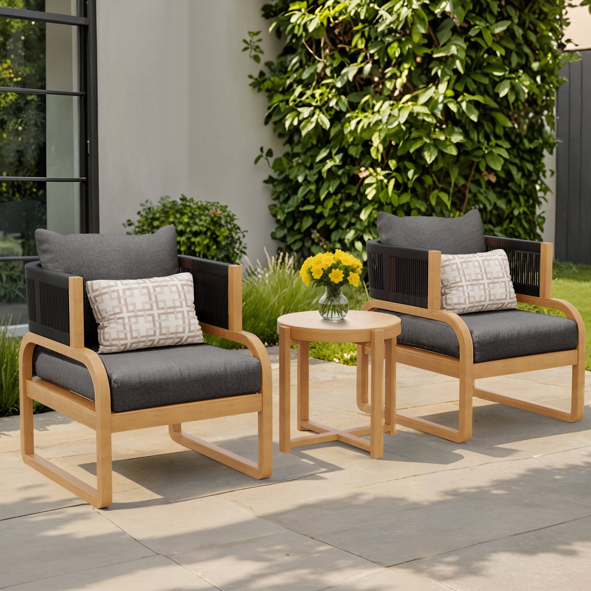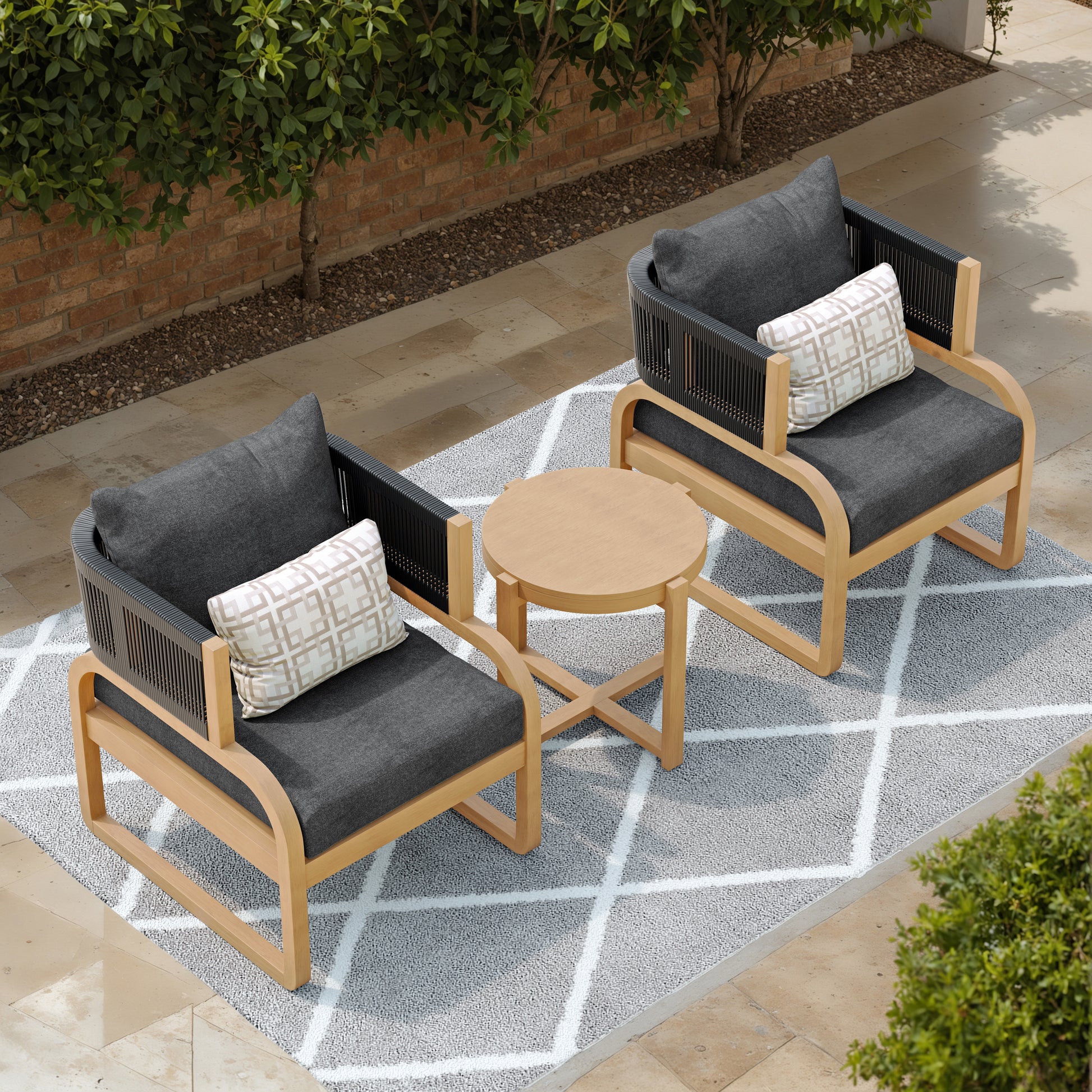 - The set includes 2 chairs, 1 table, 4 seat cushions and 2 decorative cushions