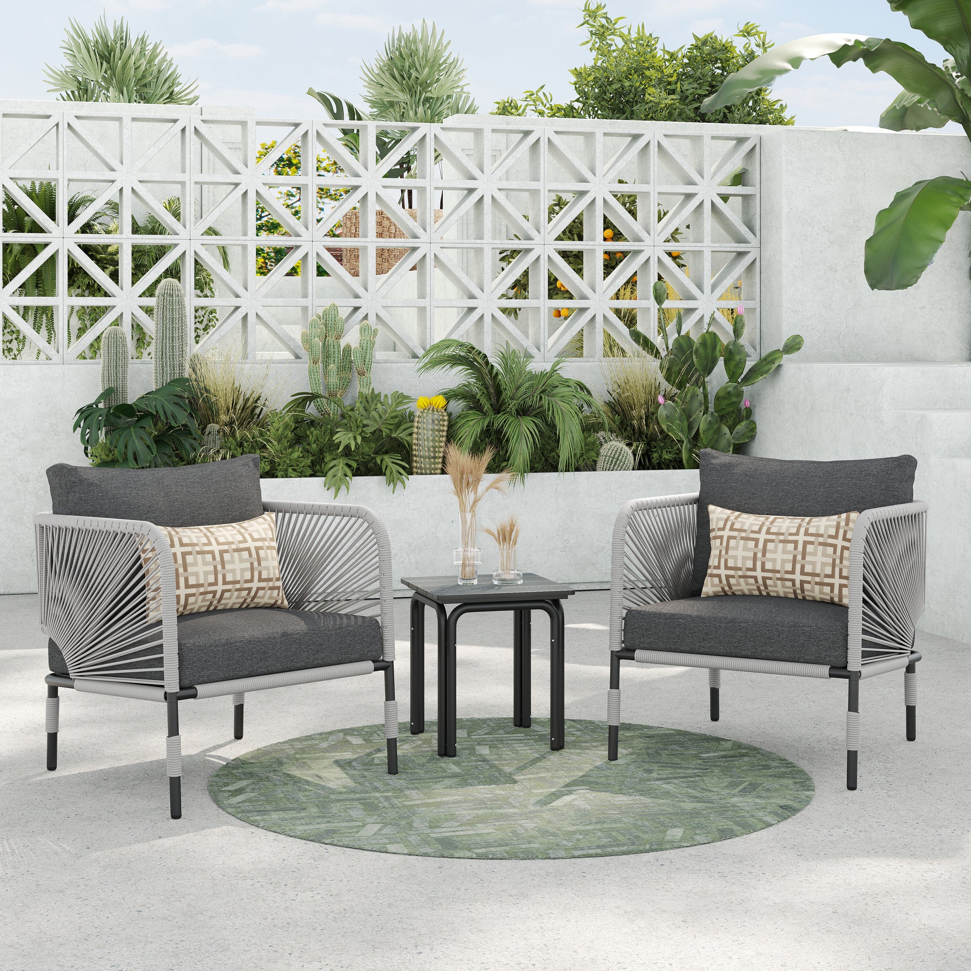 - The set includes 2 chairs, 1 table, 4 seat cushions and 2 decorative cushions