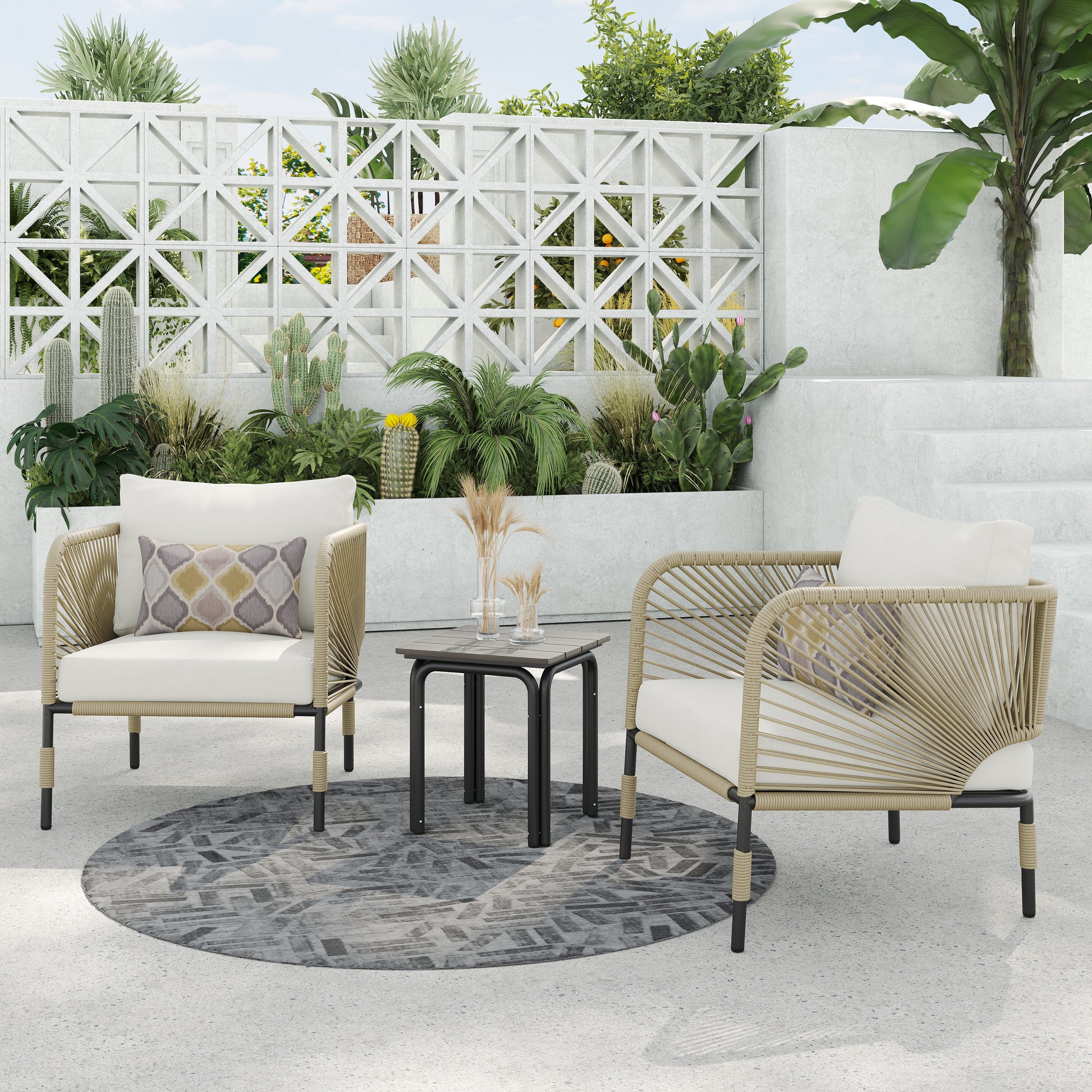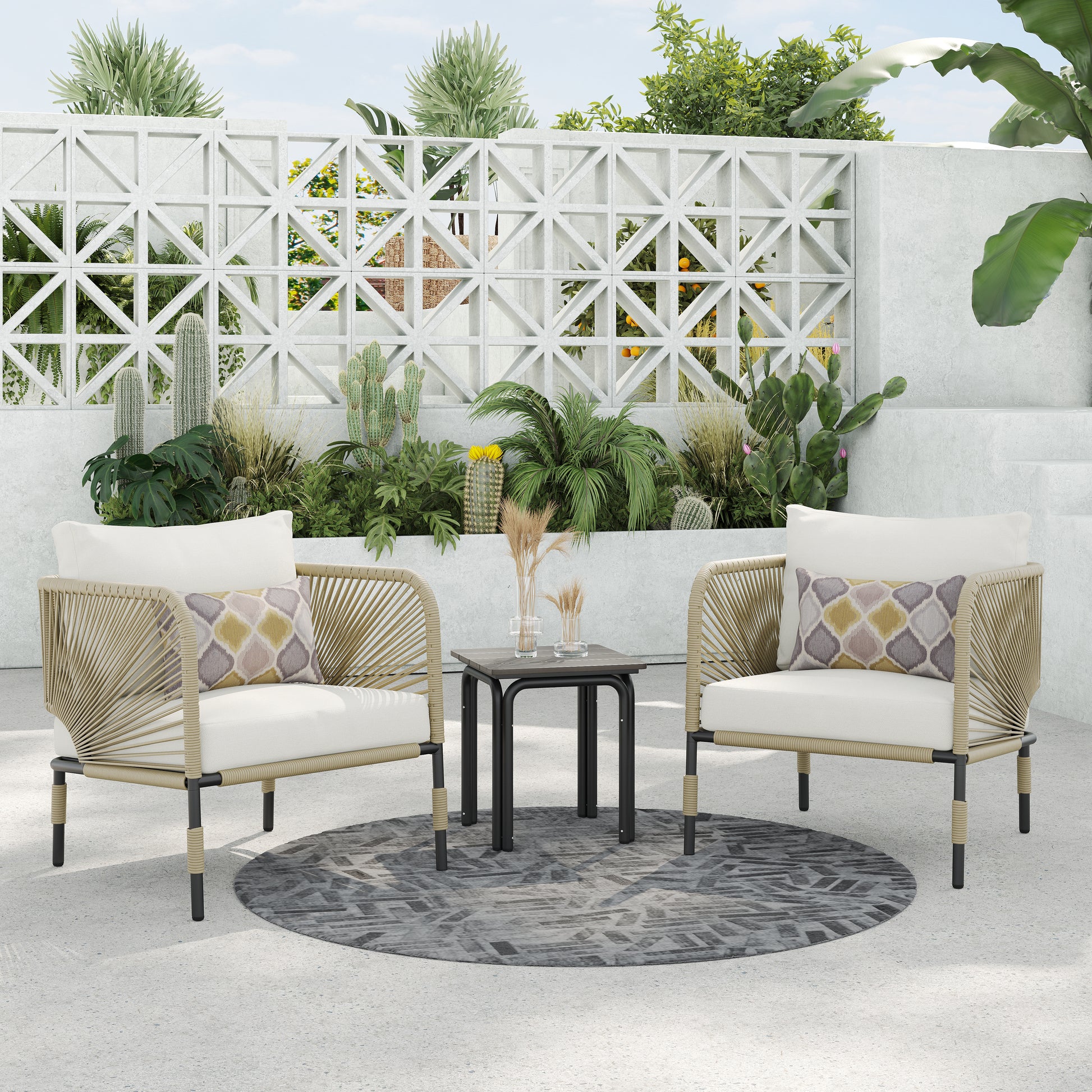 - The set includes 2 chairs, 1 table, 4 seat cushions and 2 decorative cushions
