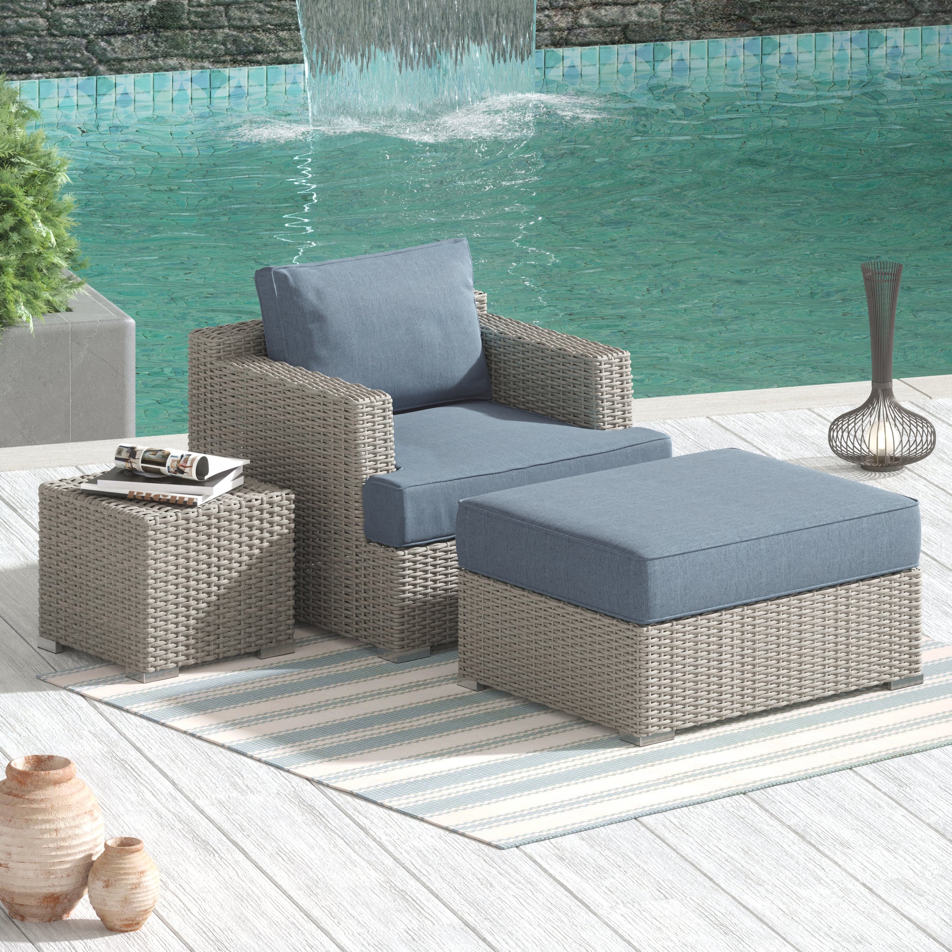 The pieces feature a thick, sturdy, hand-welded aluminum frame covered in hand-woven, UV-resistant synthetic resin wicker. The cushions are made of weather-resistant Sunbrella fabric and filled with high-density foam to optimize support and maximize comfort.