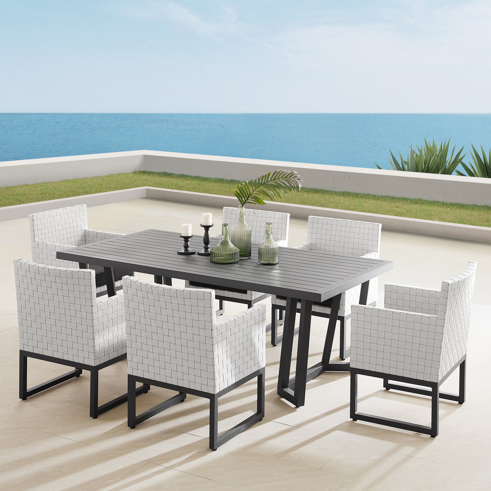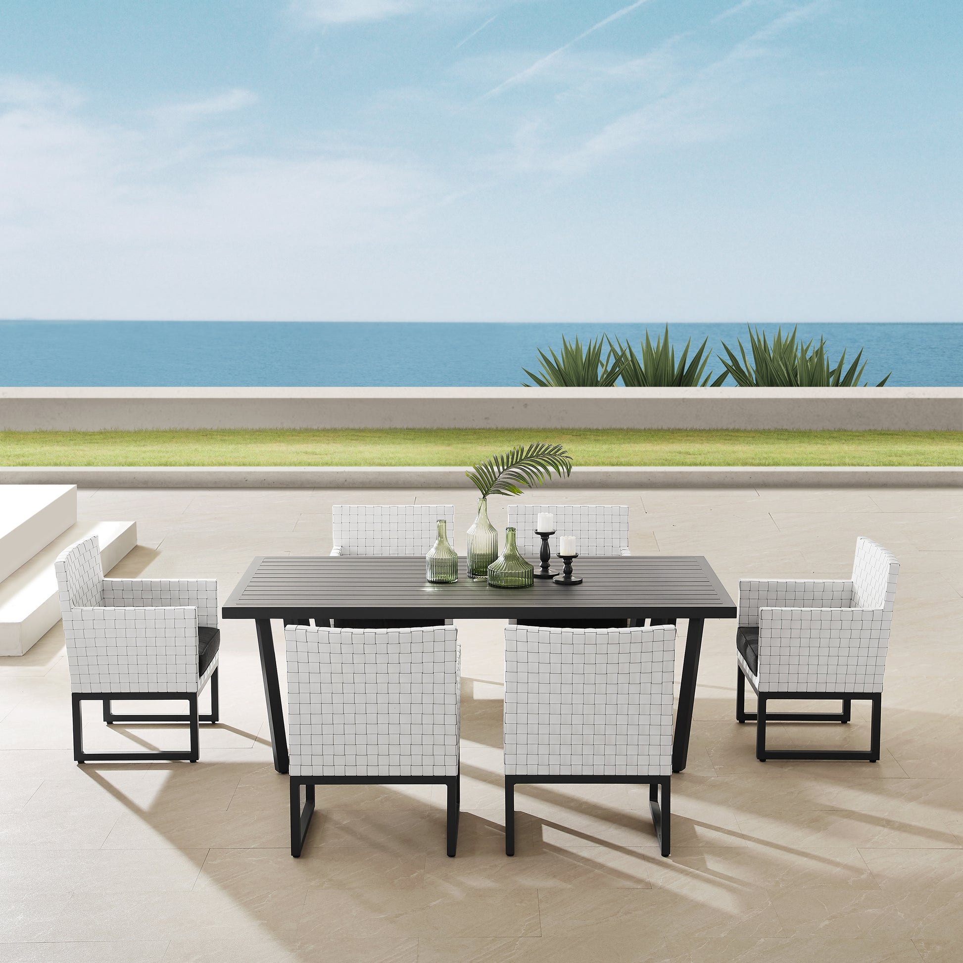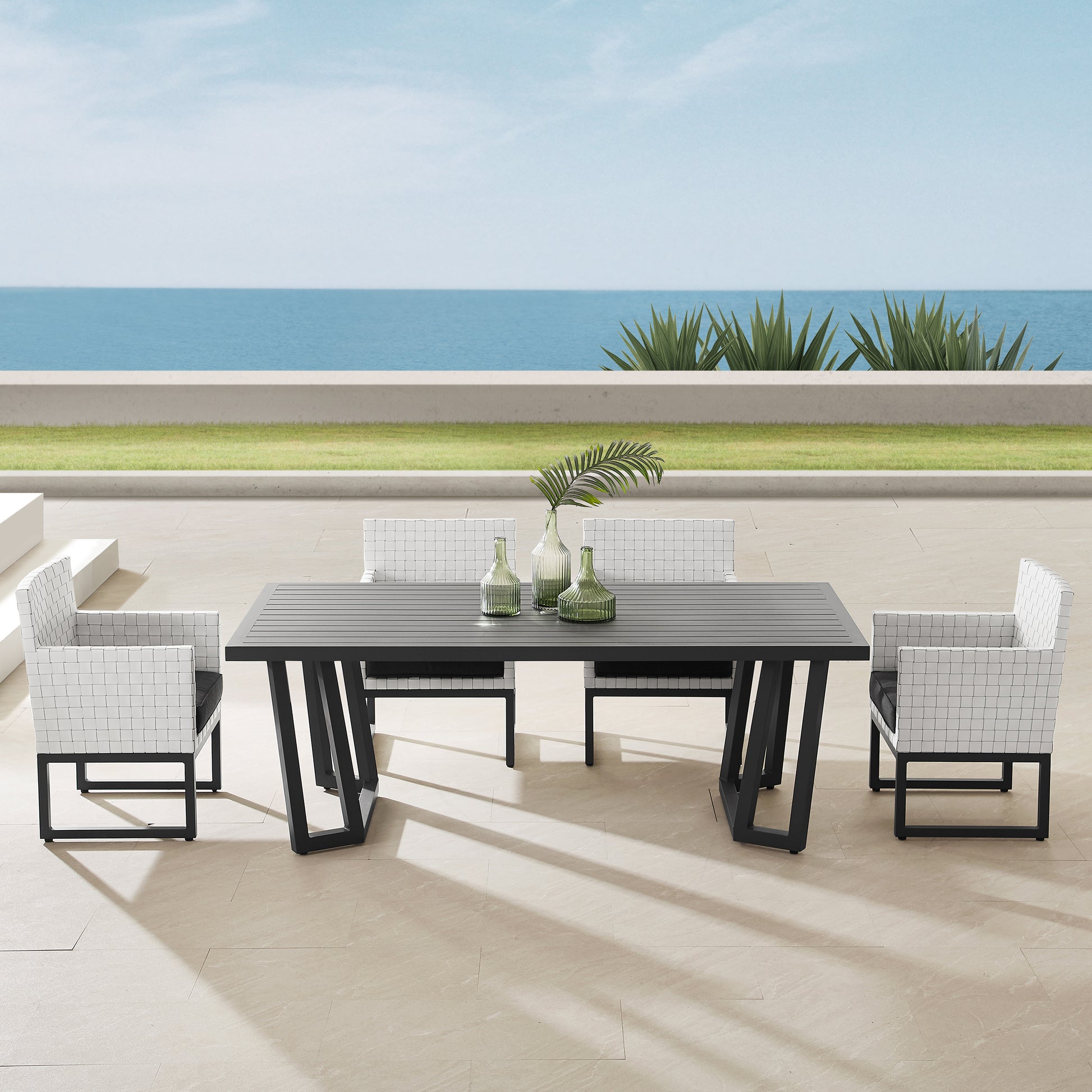 The table is made of powder-coated aluminum. It features a 5 cm (2 in) umbrella hole. Each chair features a hand-welded aluminum frame covered in a thick, wide-weave, UV-resistant white resin, and beautiful black Sunbrella® fabric seat cushions for a perfect contrast.