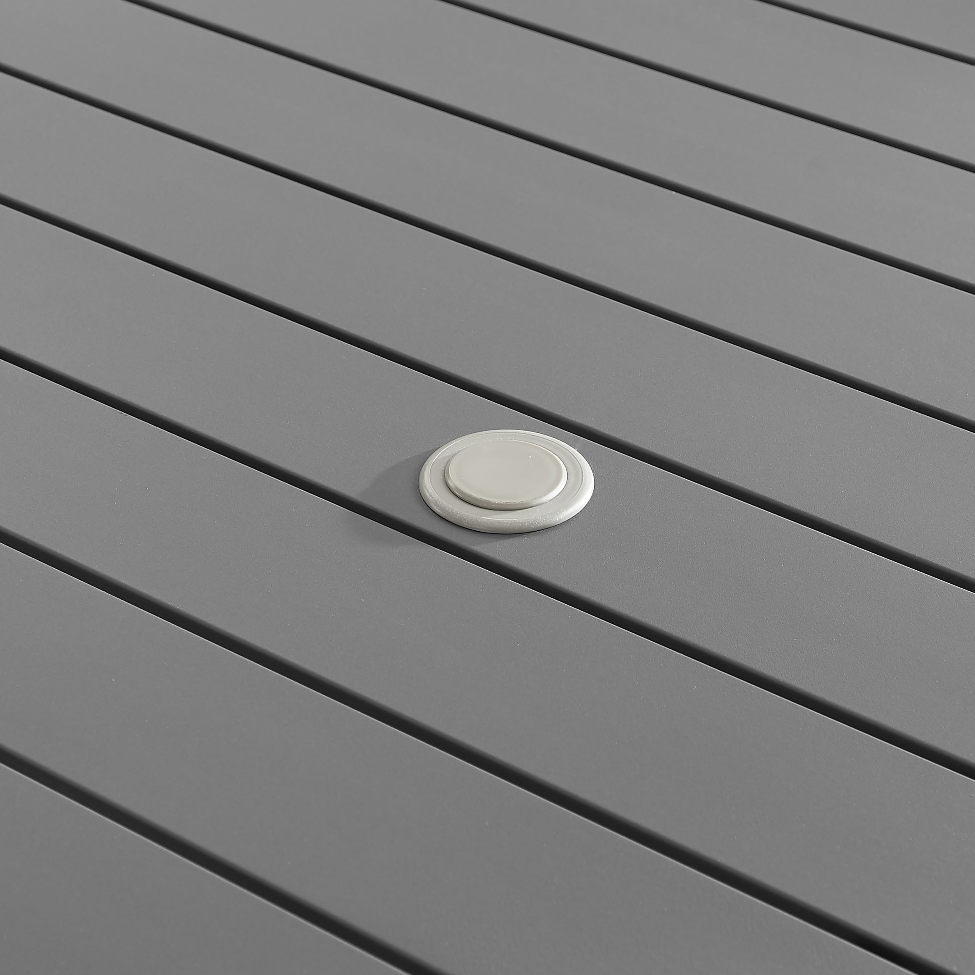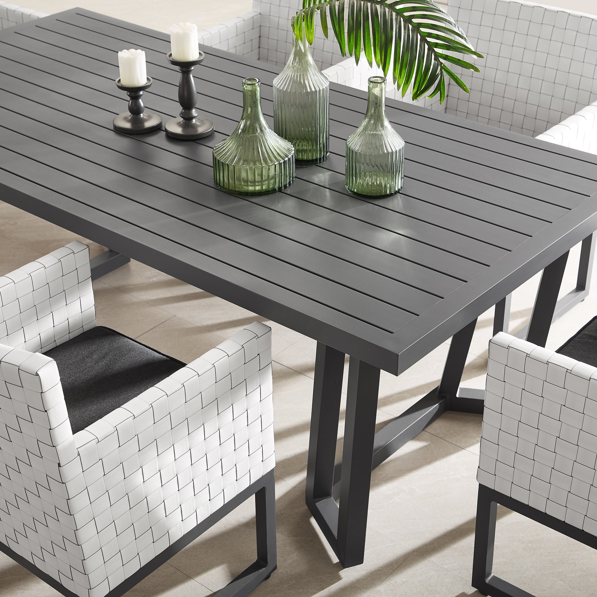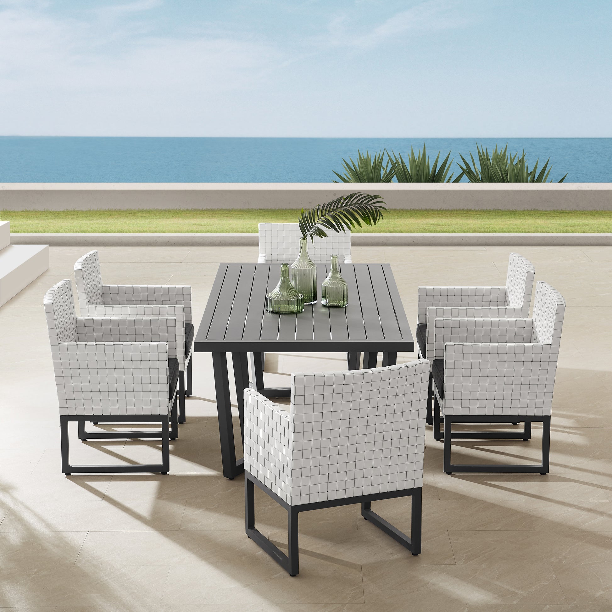 The table is made of powder-coated aluminum. It features a 5 cm (2 in) umbrella hole. Each chair features a hand-welded aluminum frame covered in a thick, wide-weave, UV-resistant white resin, and beautiful black Sunbrella® fabric seat cushions for a perfect contrast.