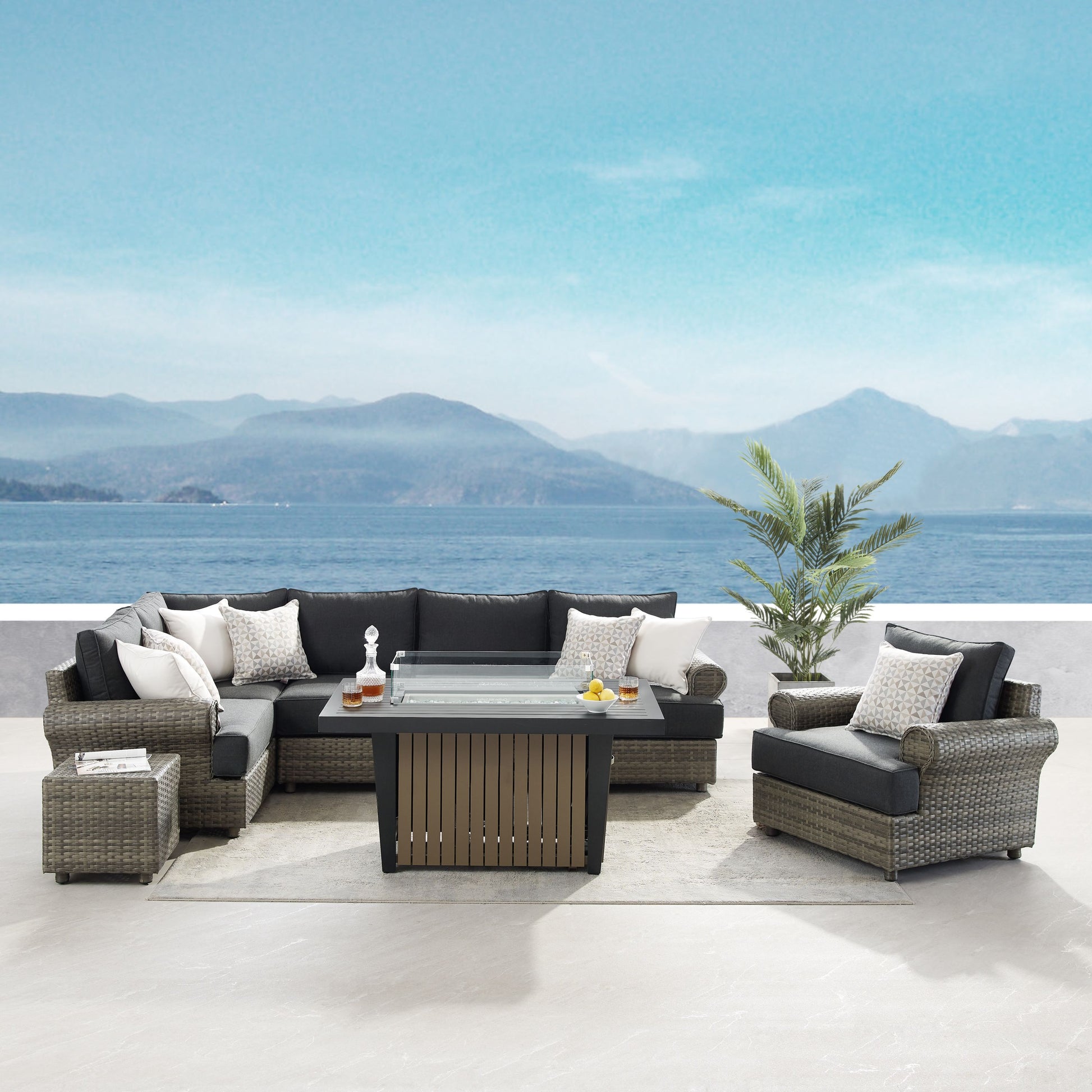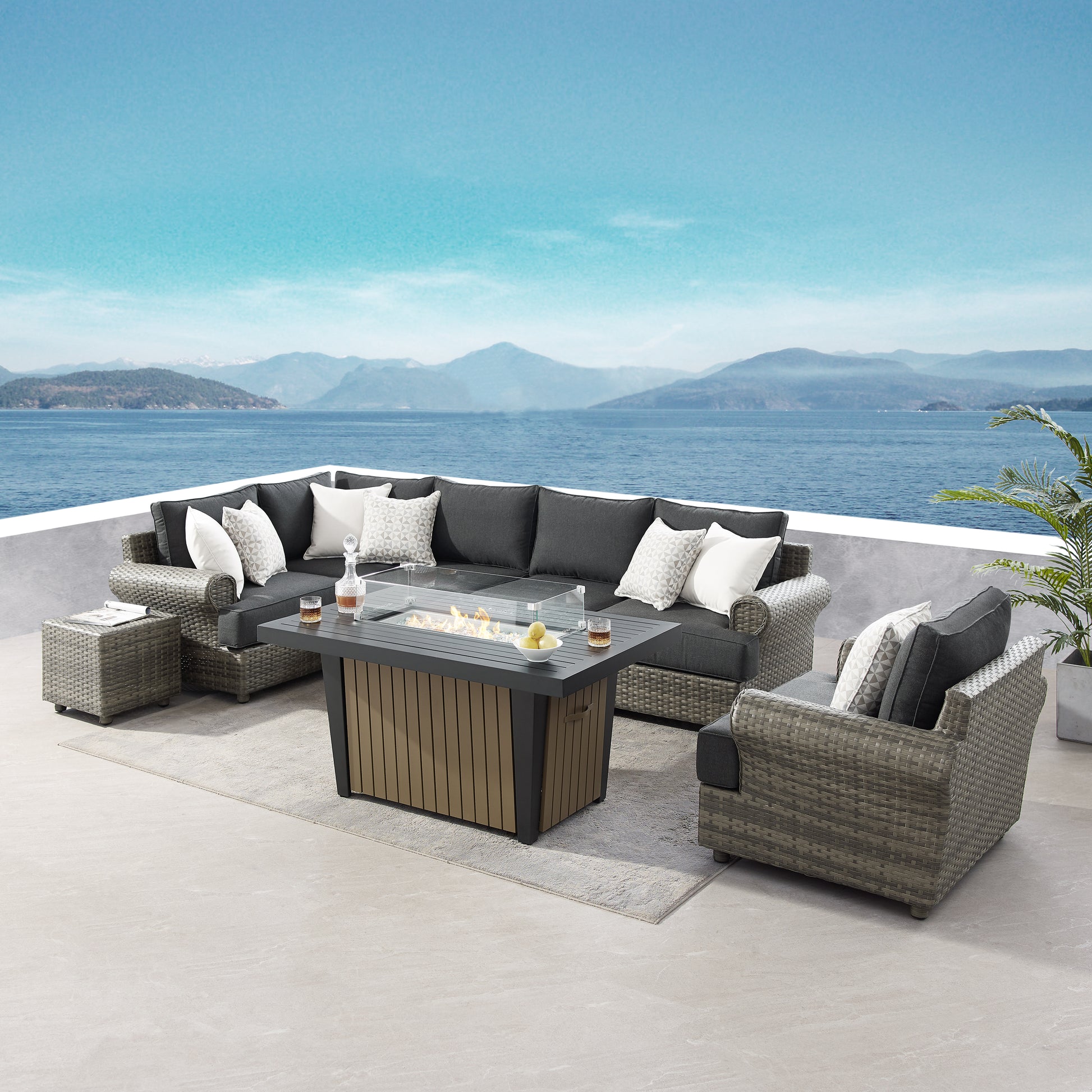Enjoy cozy evenings with our built-in fire pit table, perfect for creating a welcoming and friendly atmosphere during your outdoor gatherings. Made with weather-resistant materials, this set guarantees exceptional longevity while withstanding the natural elements.