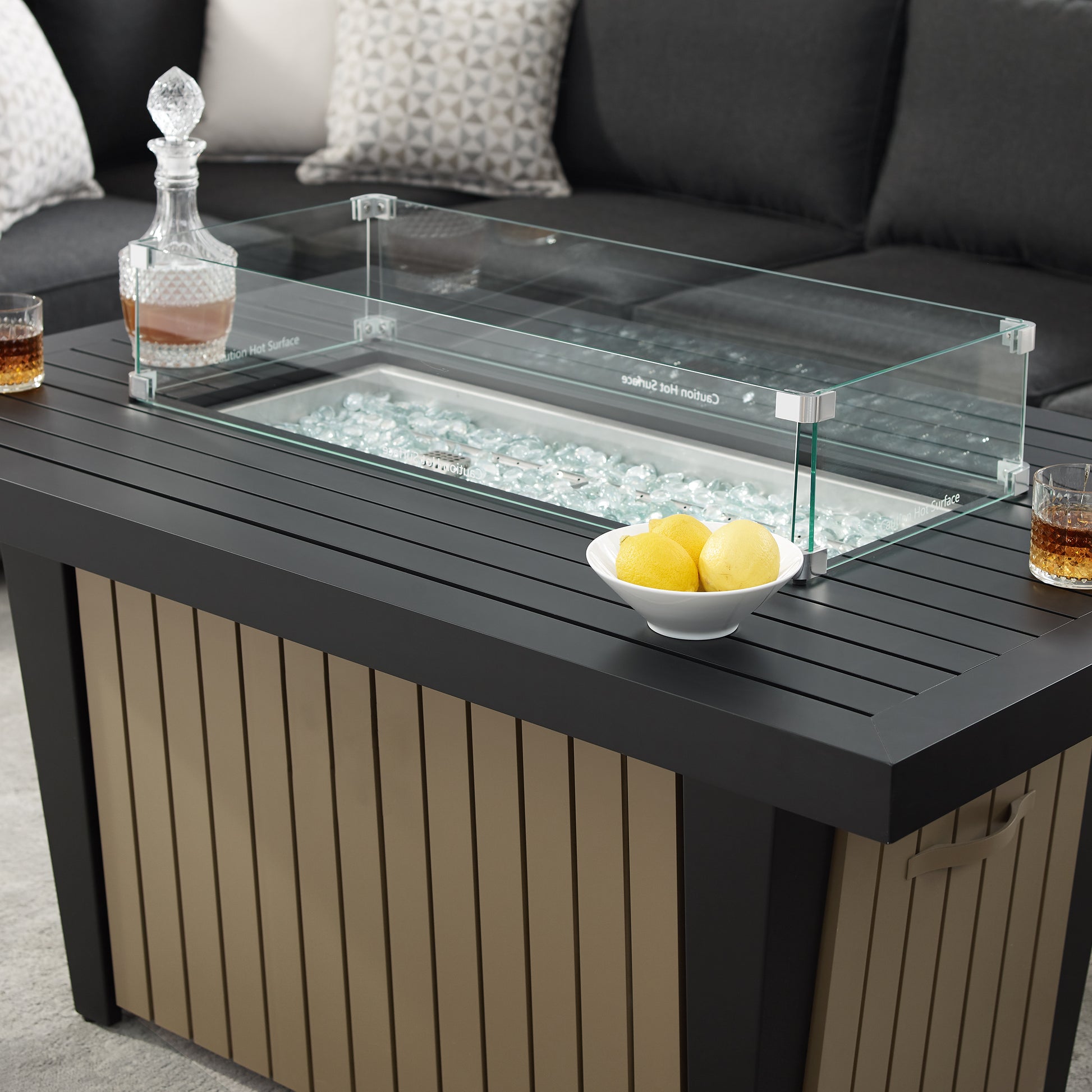 - The fire pit table is made of aluminum with a powder-coated finish.
