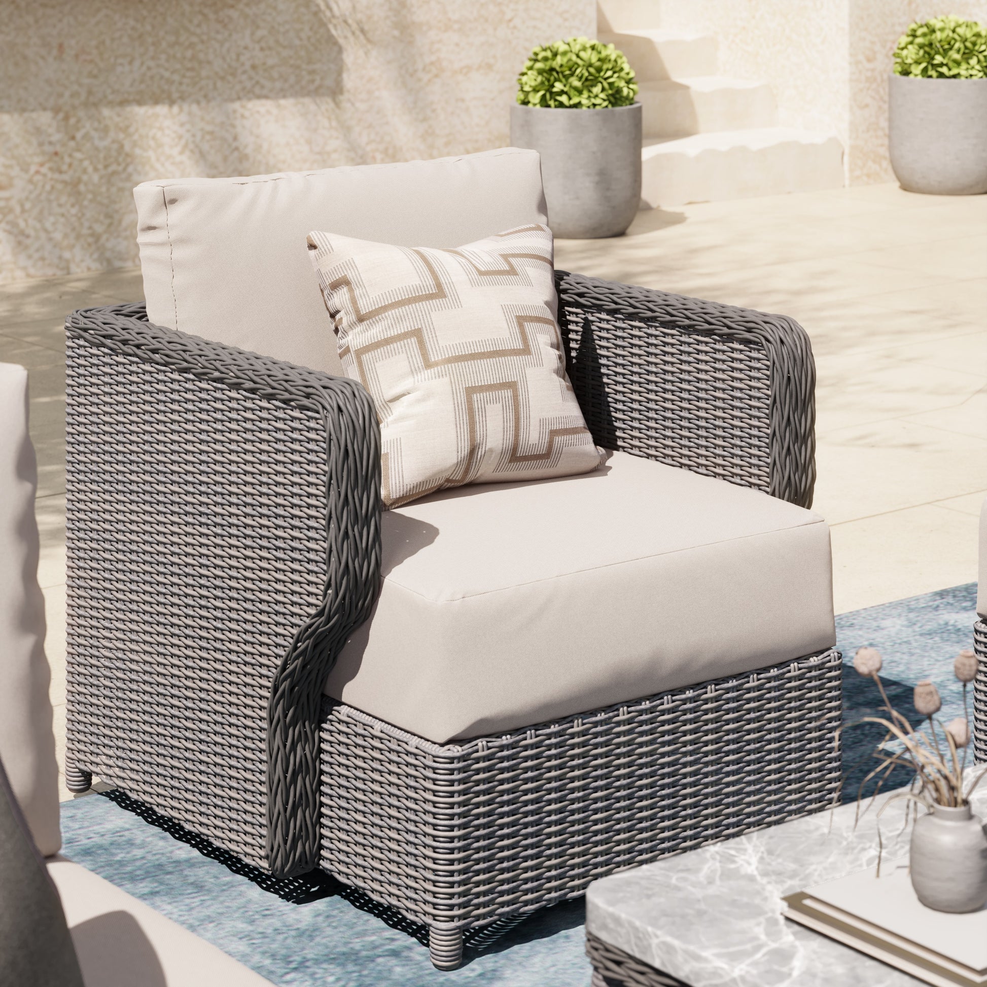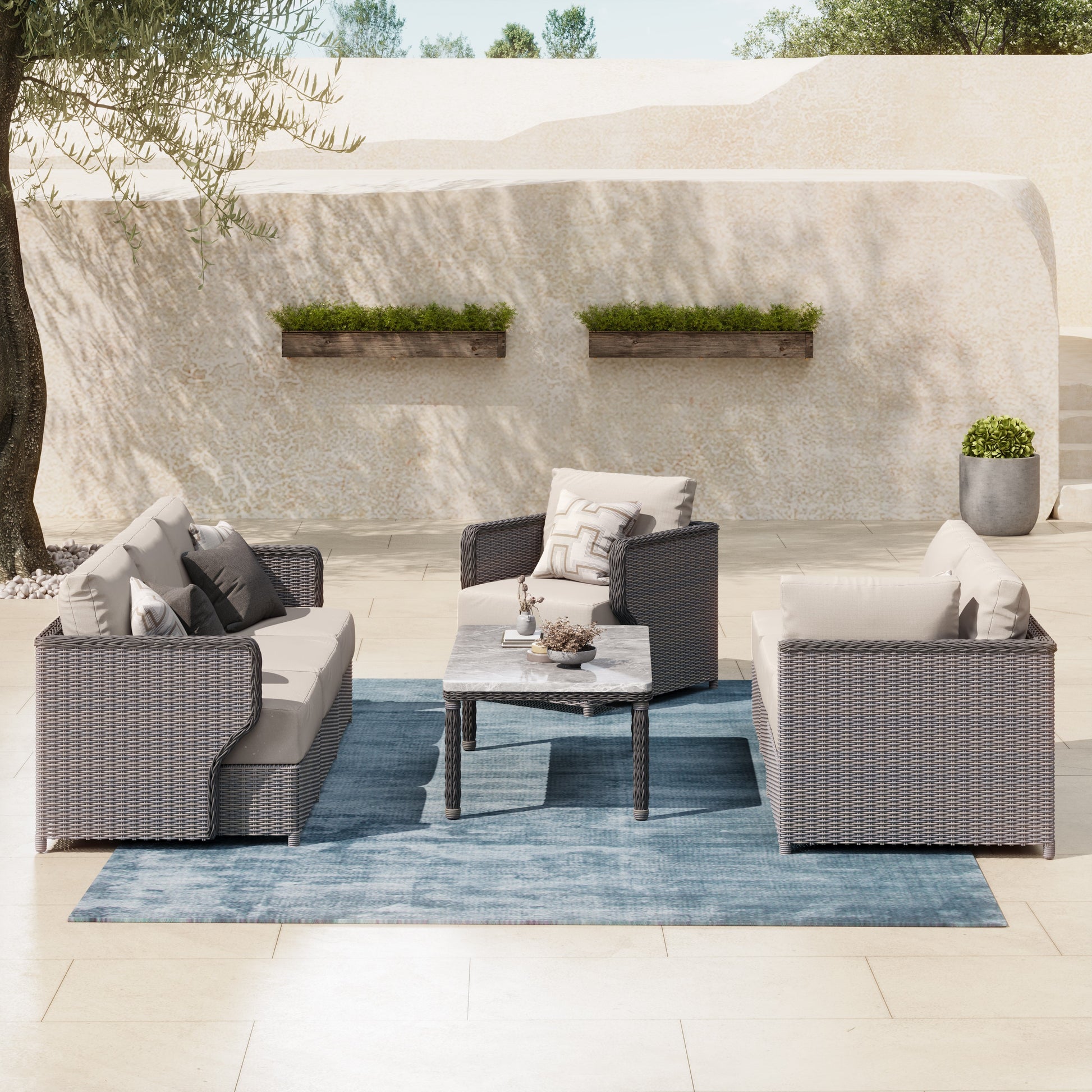 Crafted with durable, weather-resistant materials, this set offers remarkable longevity. The cushions are designed to provide optimal comfort while retaining their shape, and are upholstered in Sunbrella fabric.
