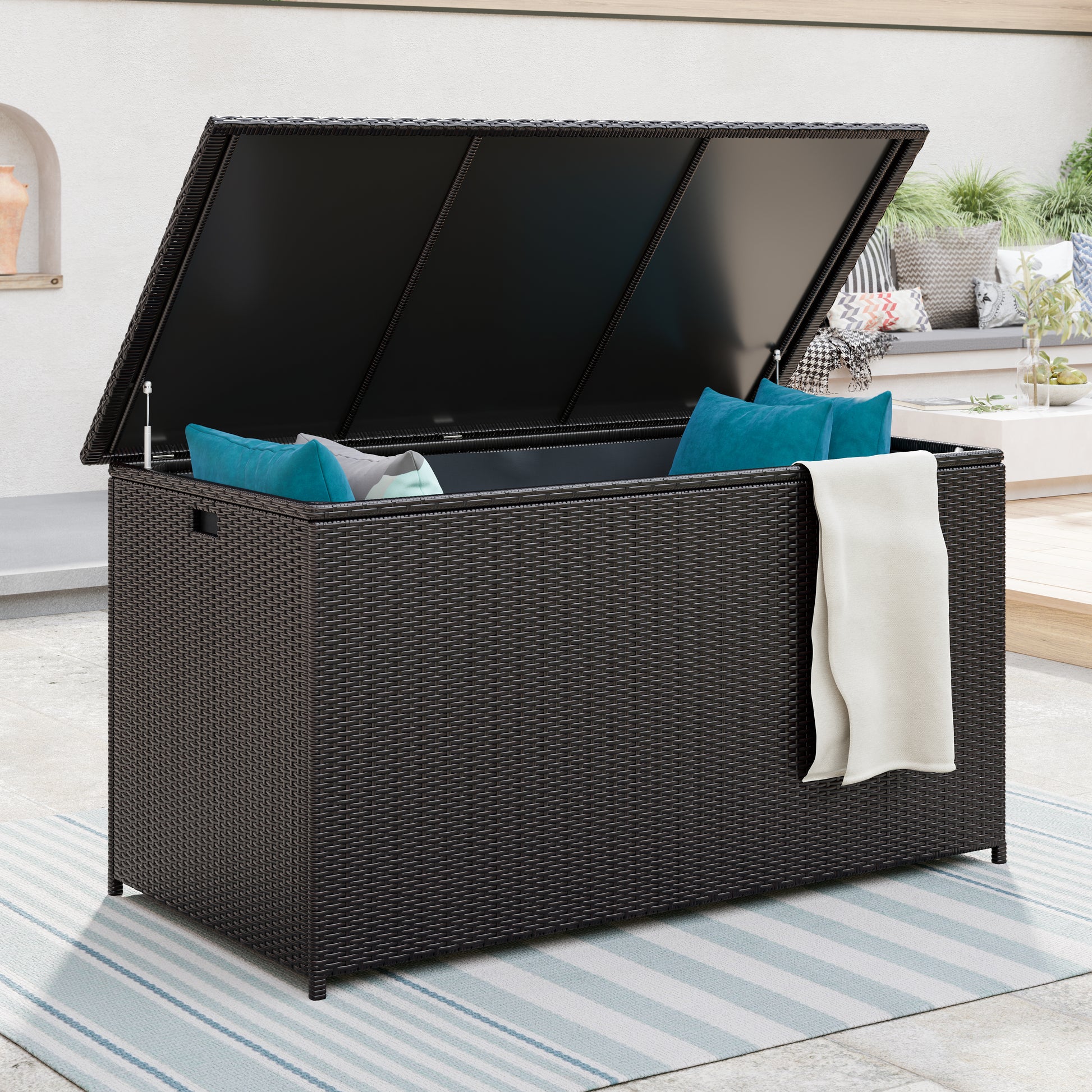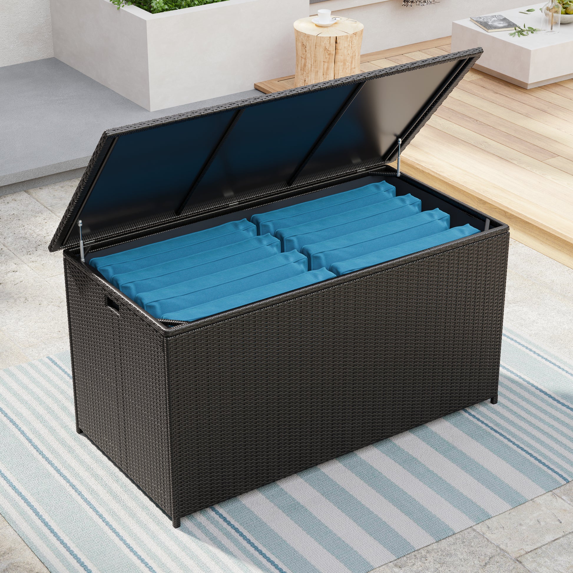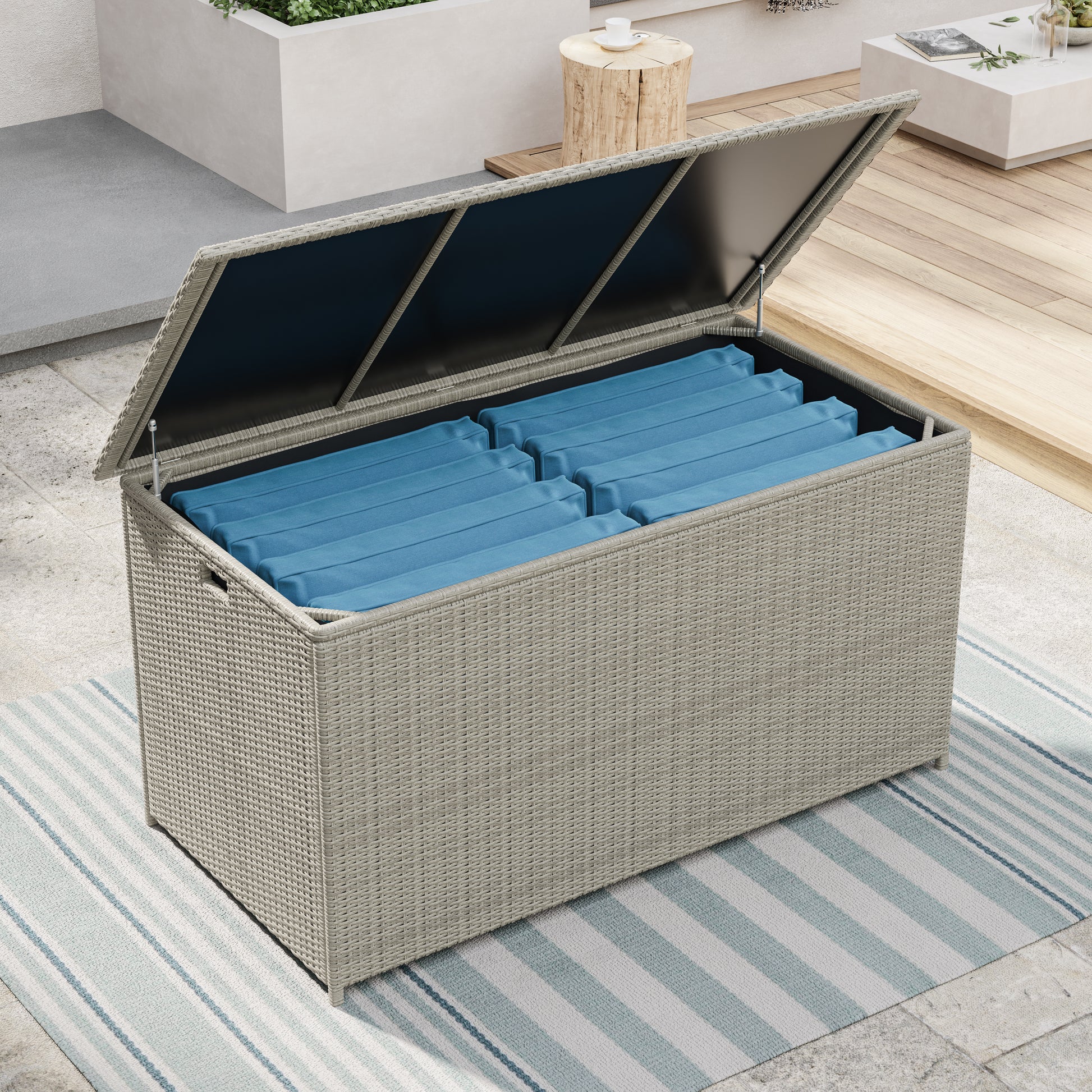 Dans une teinte élégante, ce coffre de rangement est idéal pour stocker des coussins ou tout autre accessoire de jardin. Construit avec une structure en aluminium recouverte de résine tressée de manière solide, ce coffre de terrasse est également équipé d'un couvercle imperméable en Plexiglas et de charnières pneumatiques. Peu importe le style de votre espace extérieur, ce coffre apportera à la fois fonctionnalité et esthétique pour de nombreuses années à venir !